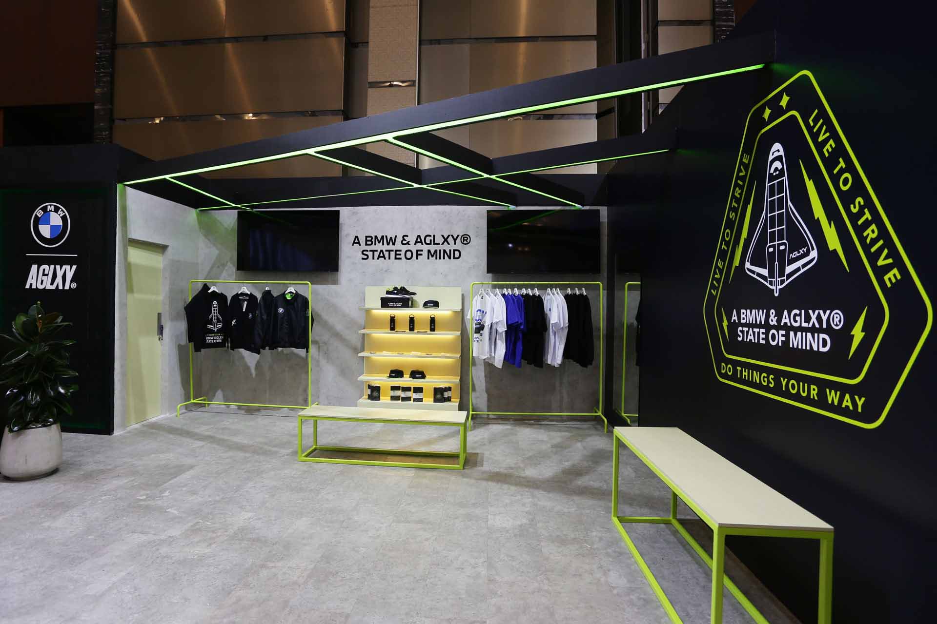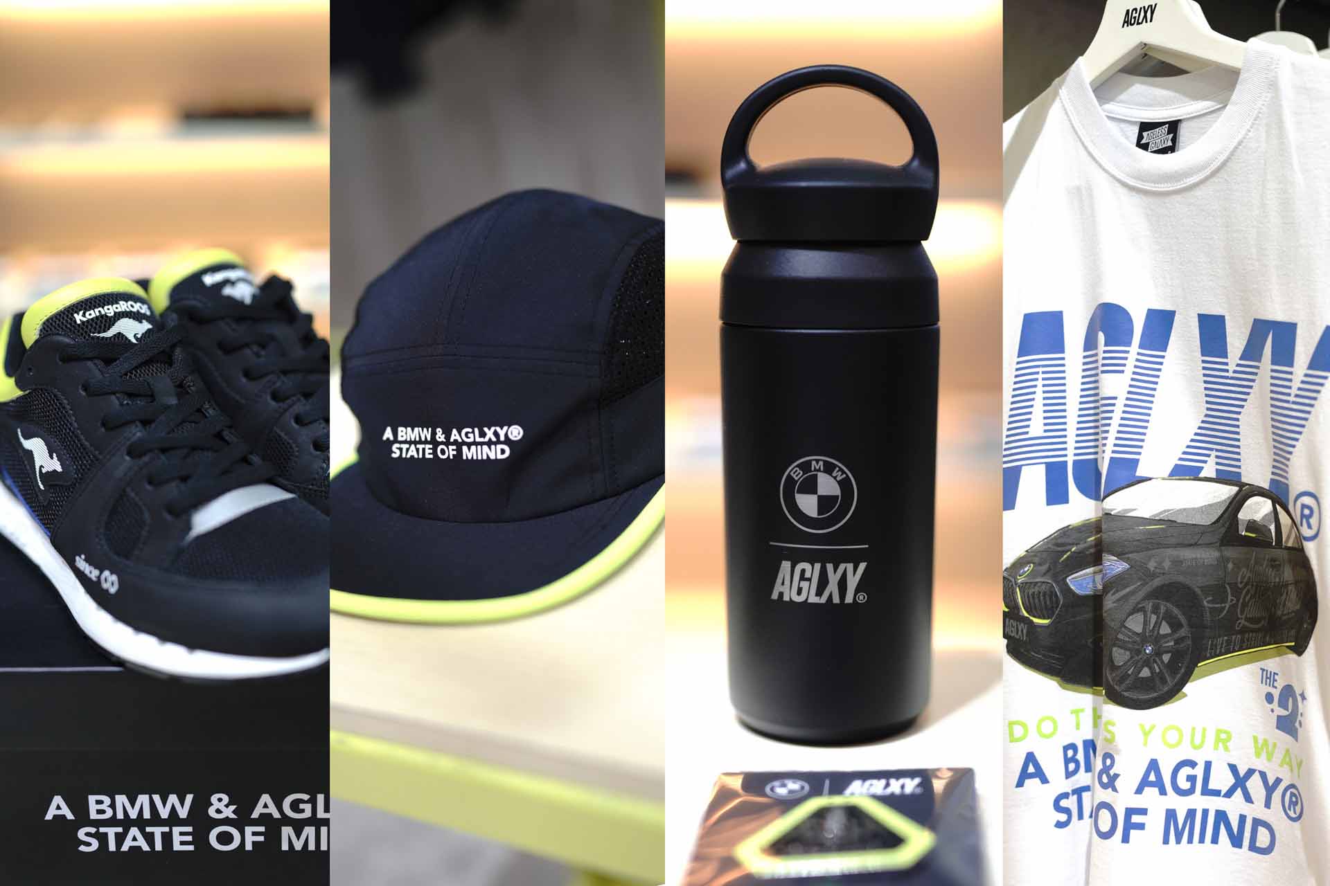 - Unisex Apparel dan Lifestyle Collection AGLXY x BMW: Do Things Your Way yang meliputi T-shirt, long sleeves shirt, bomber jacket, cardigan, track pants, jogger pants, dan running caps dalam berbagai motif dan grafis A State of Mind dalam balutan warna khas BMW: hitam, biru, dan putih. Hingga ke aksesoris berupa key chain, enamel pin, dan air freshner tag, stickers, notebook, hingga tumbler untuk lengkapi style sehari-hari Anda.